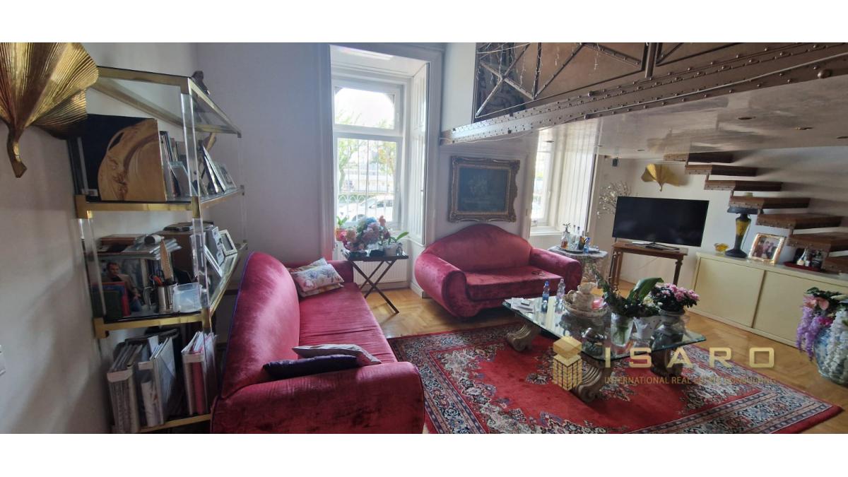 On the Buda side, a few meters from the bank of the Danube, a few dozen meters from the Margaret Bridge, an apartment of 110 square meters + 33 square meters of habitable mezzanine (gallery) + an 18 square meter cellar is for sale.