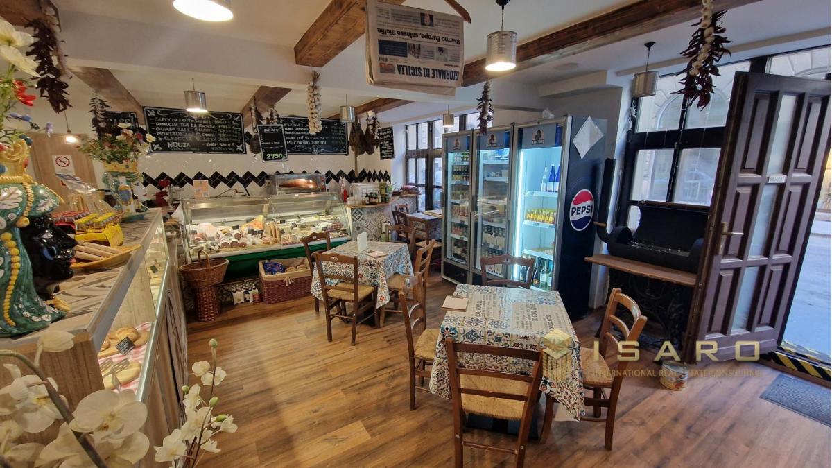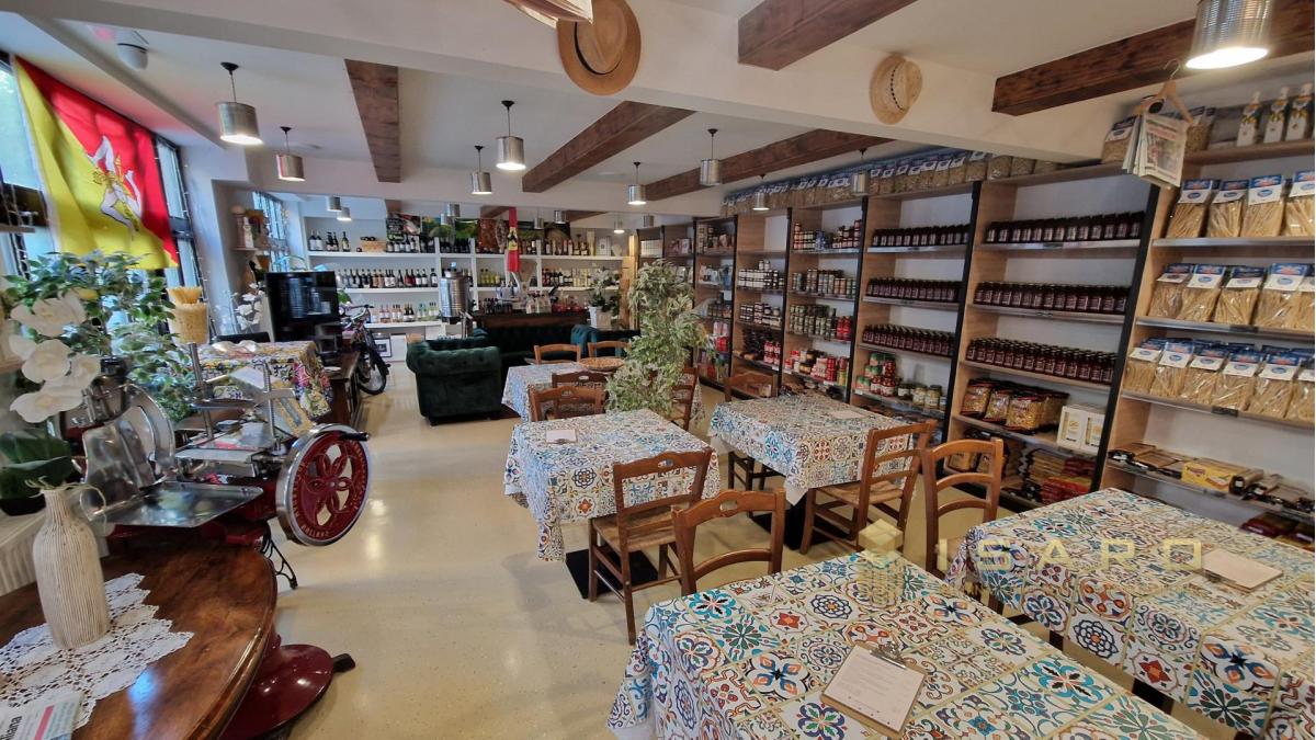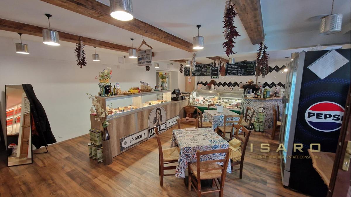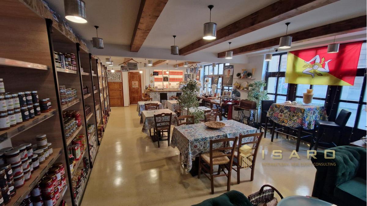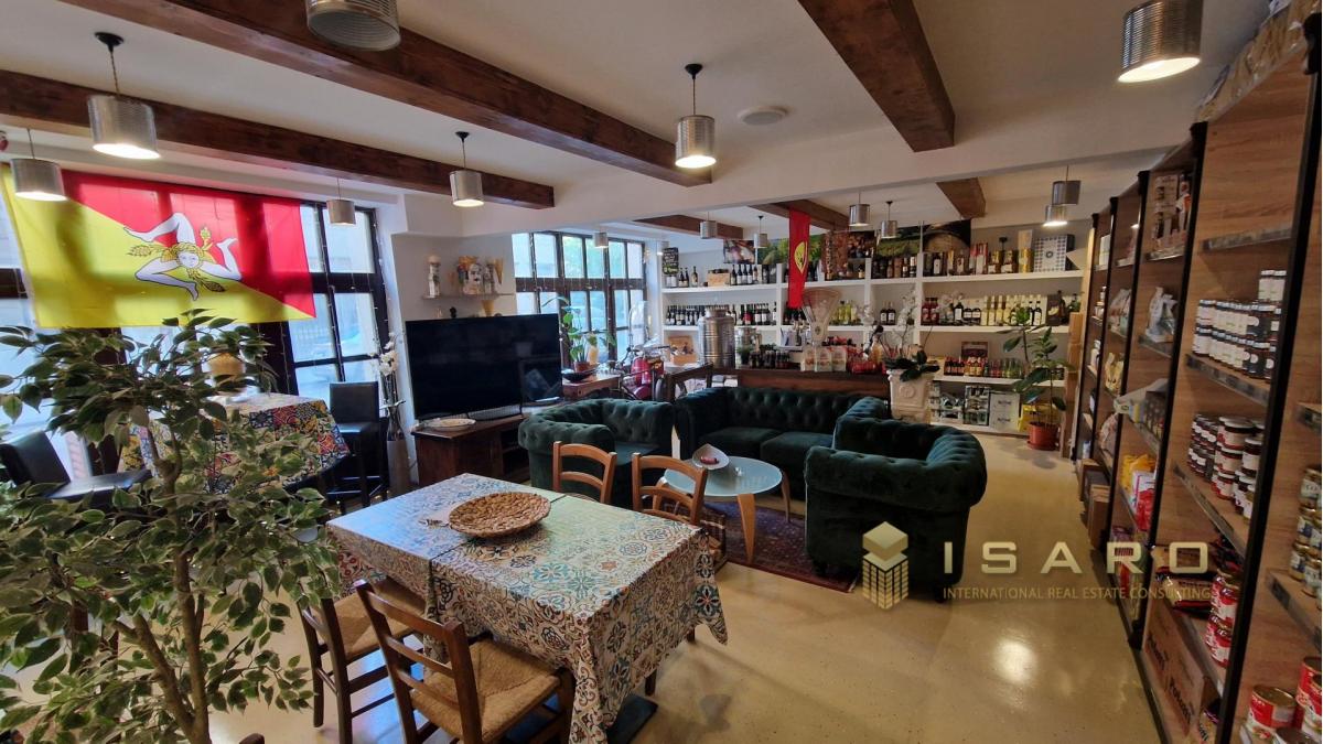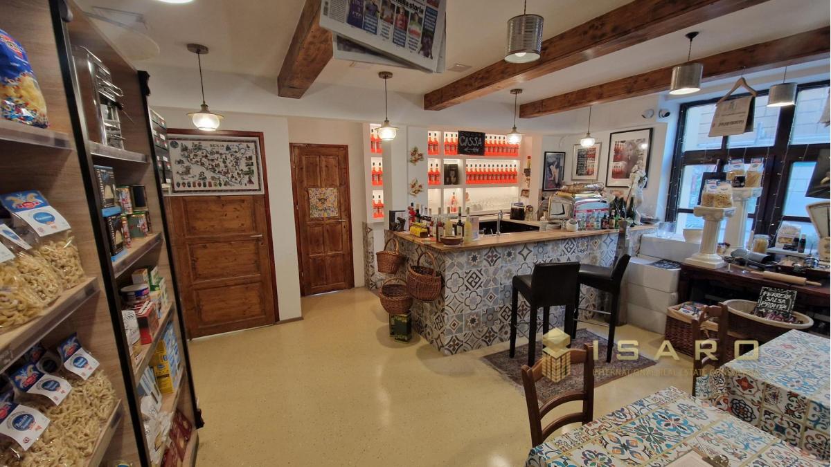 On the ground floor, which covers a total area of approximately 180 sqm, a splendid and elegant shop selling high-quality Italian food products has been created, with a small corner dedicated to catering.
